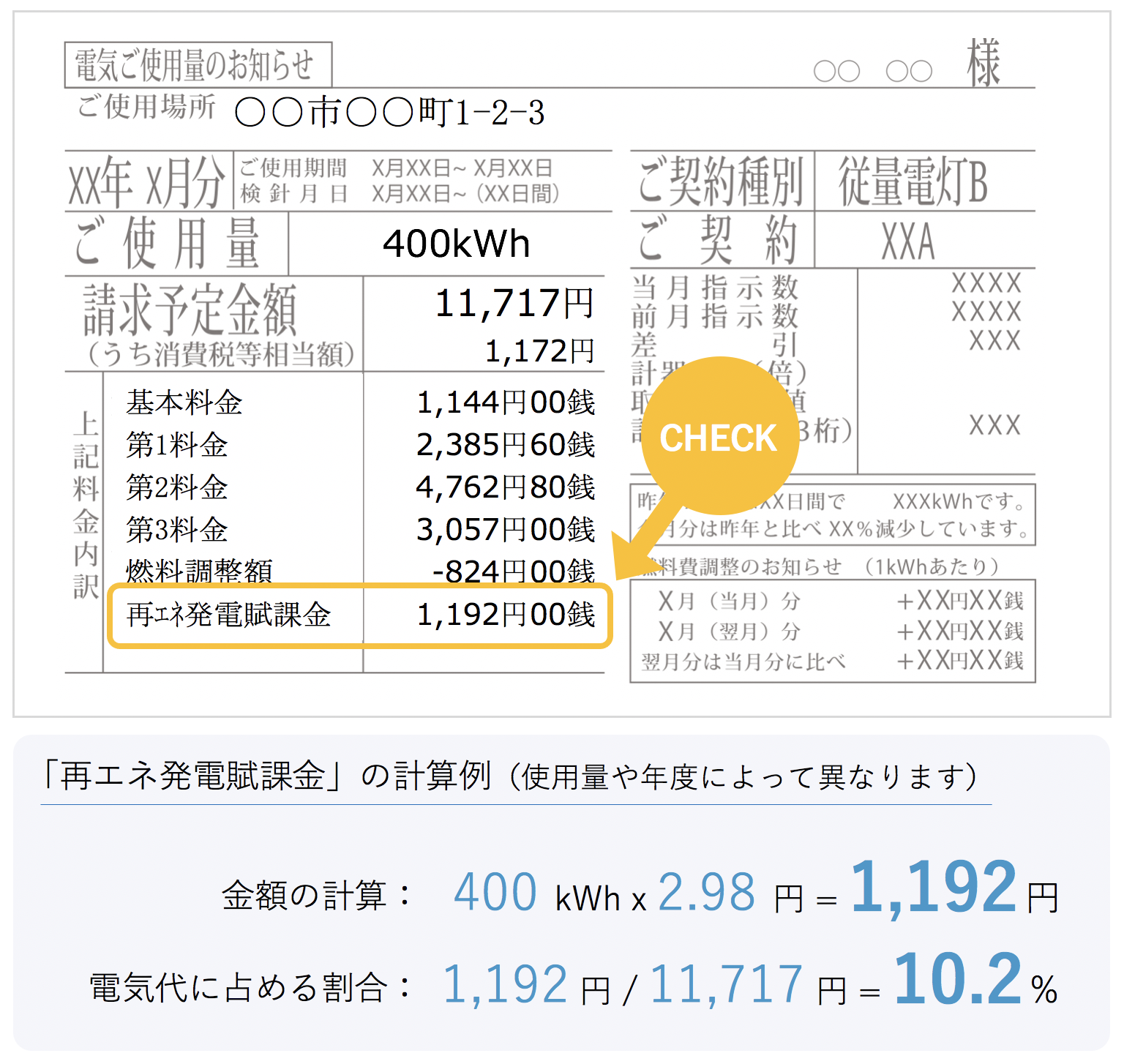 ご家庭の電気代の「検針票」を確認ください。ここに「再生エネ発電賦課金」とあります。